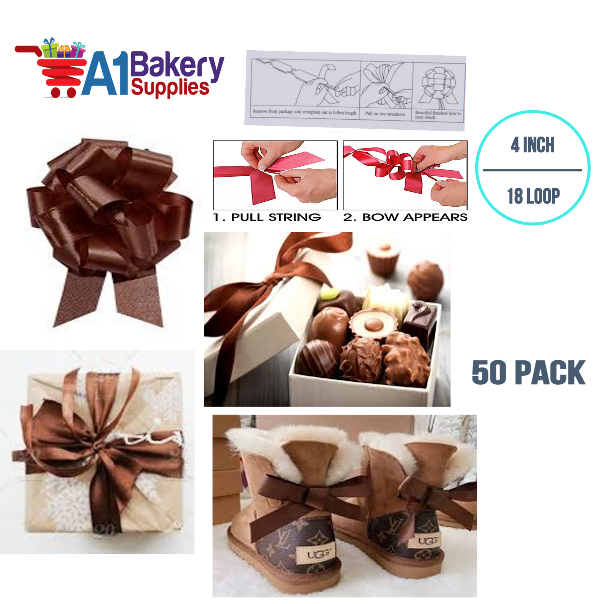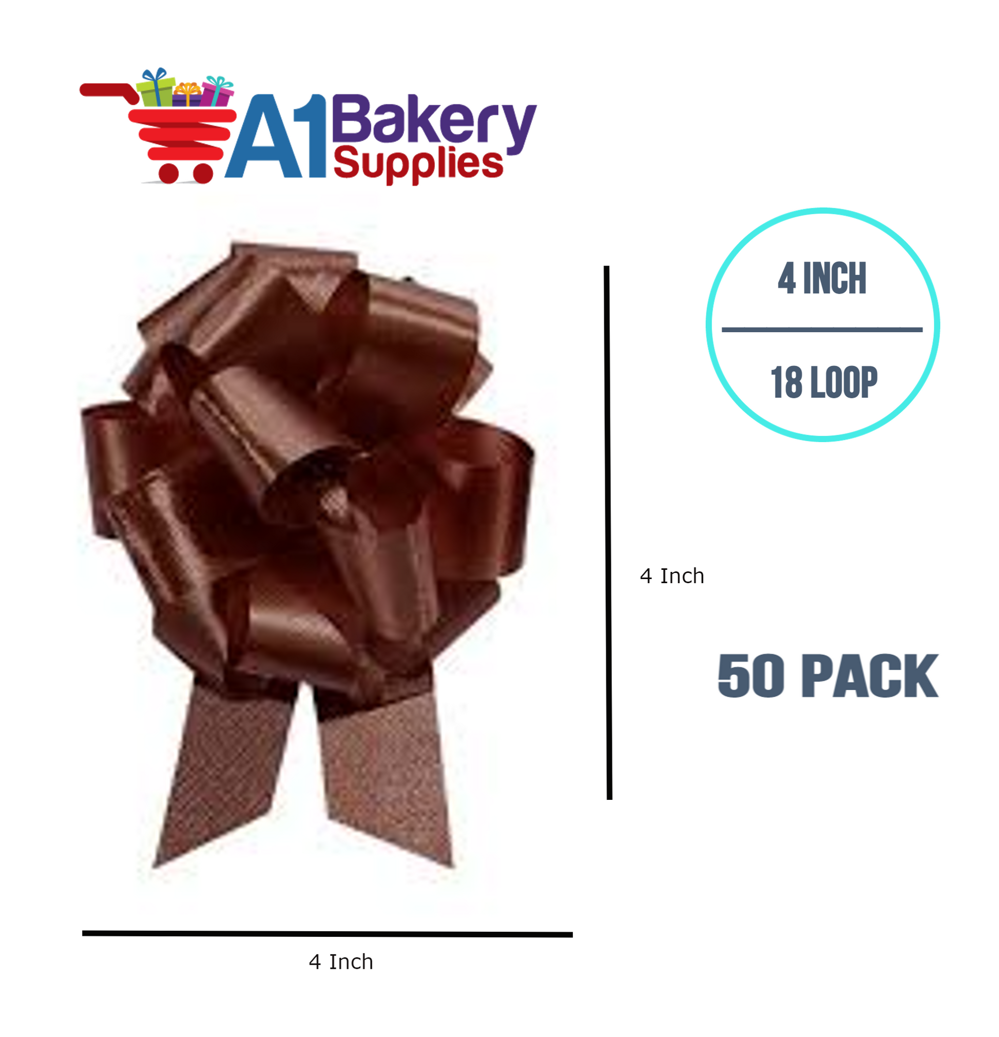 A1BakerySupplies 50 Pieces Pull Bow for Gift Wrapping Gift Bows Pull Bow With Ribbon for Wedding Gift Baskets, 4 Inch 18 Loop Chocolate Flora Satin Color