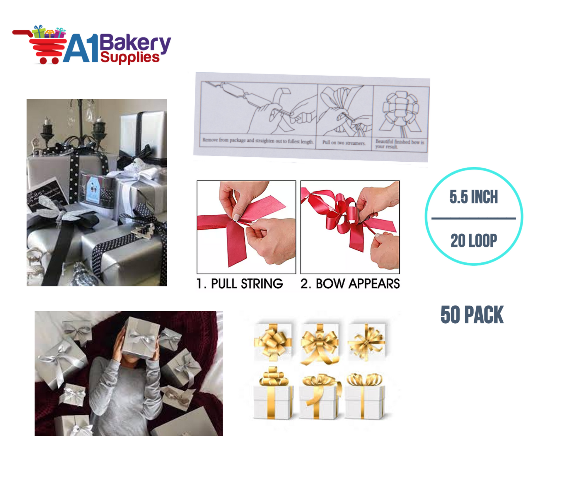 A1BakerySupplies 50 Pieces Pull Bow for Gift Wrapping Gift Bows Pull Bow With Ribbon for Wedding Gift Baskets, 5.5 Inch 20 Loop in Mixed Color