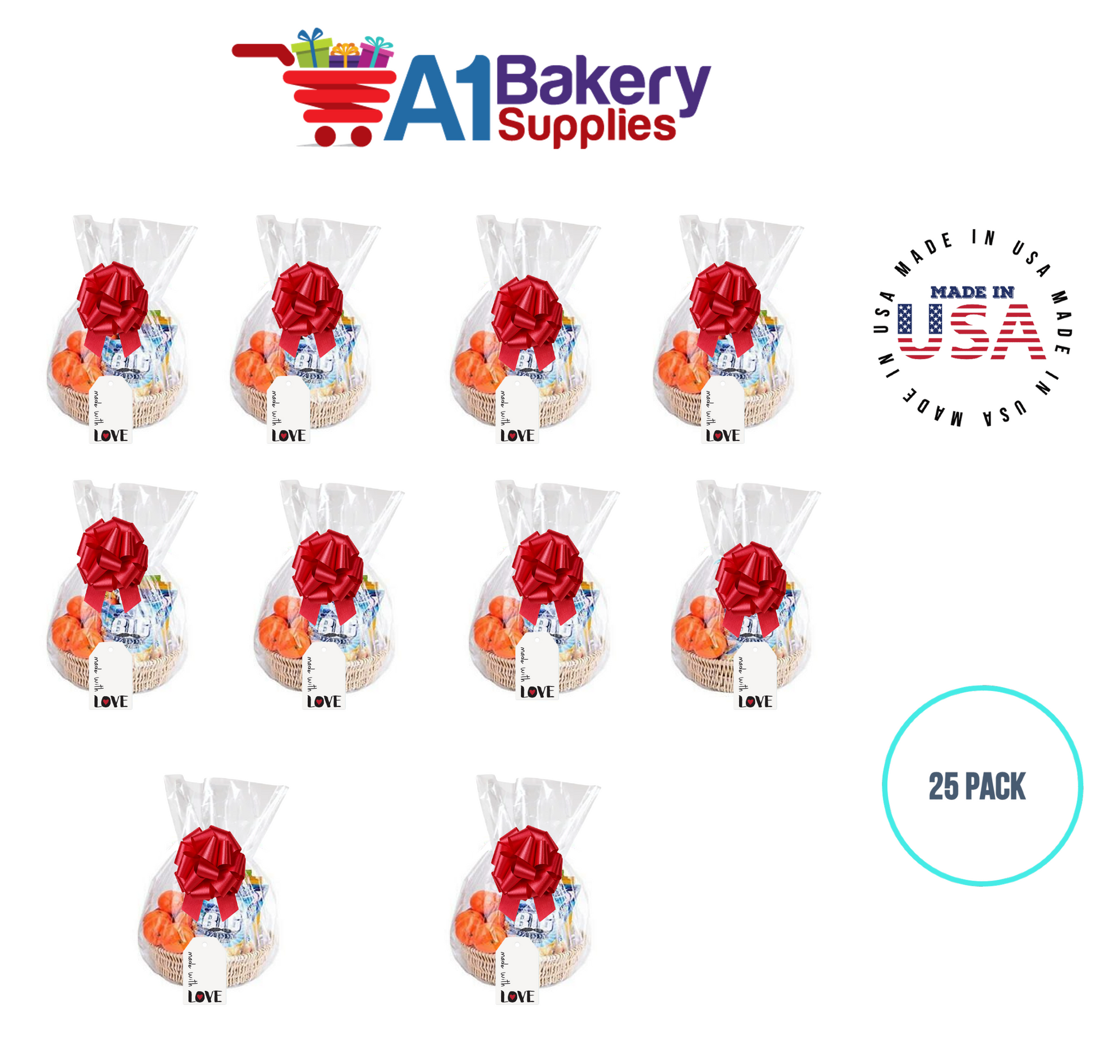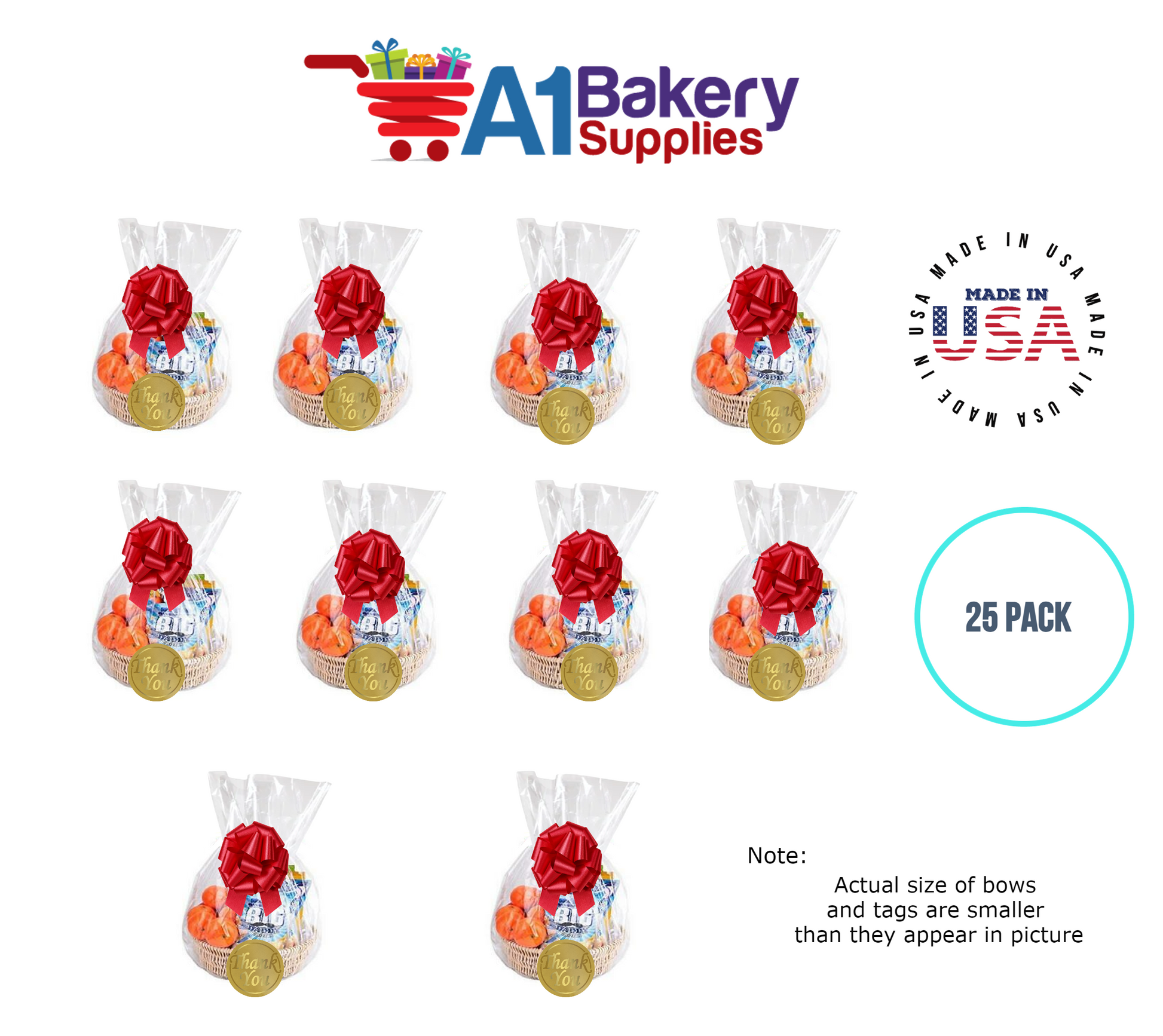 - In this order you will receive 25 Red bows , 25 thank you , 25 gift for you , 25 made with love tag and no gift basket is provided , it is only for the picture purpose and only cellophane bags are selling .