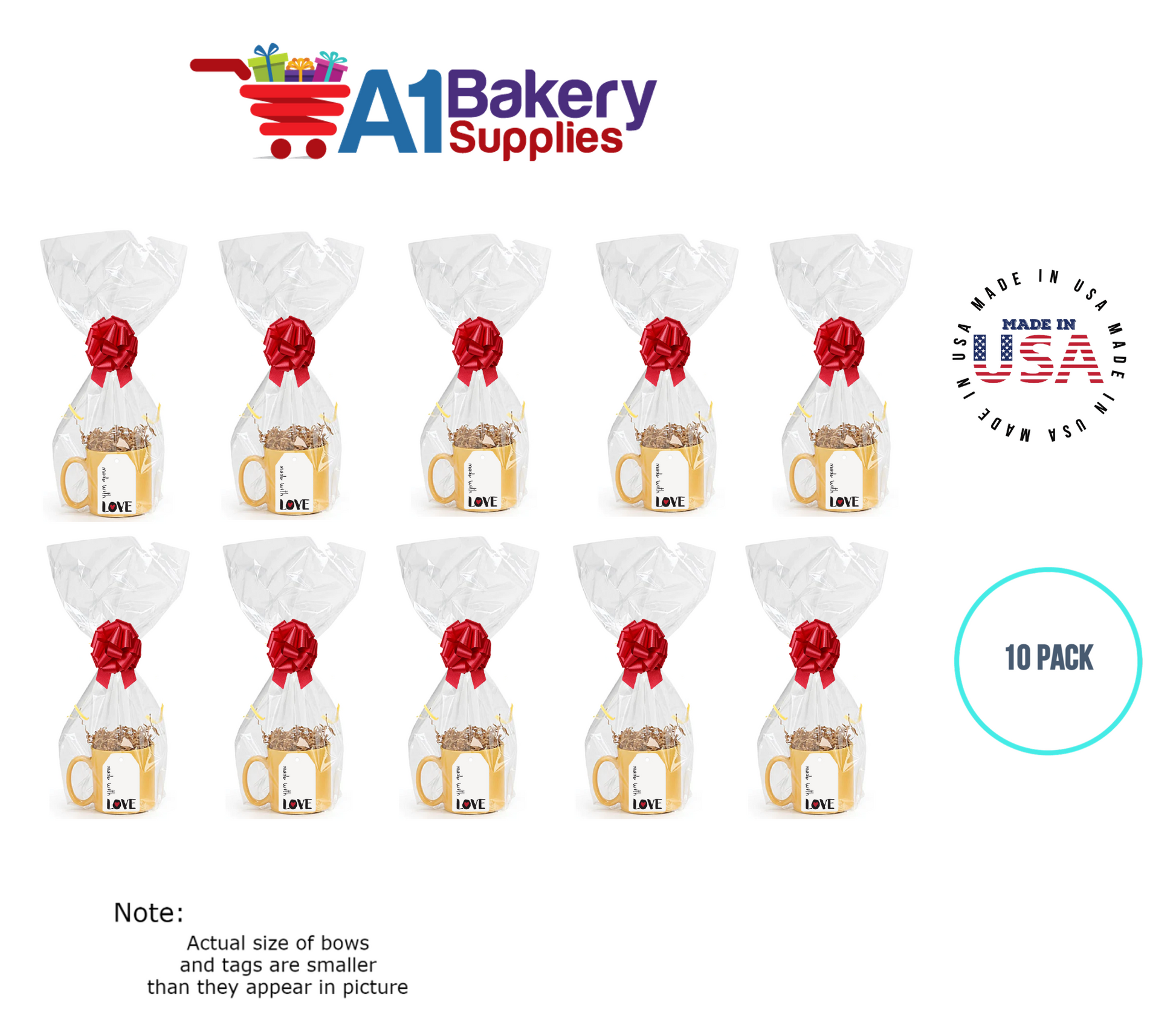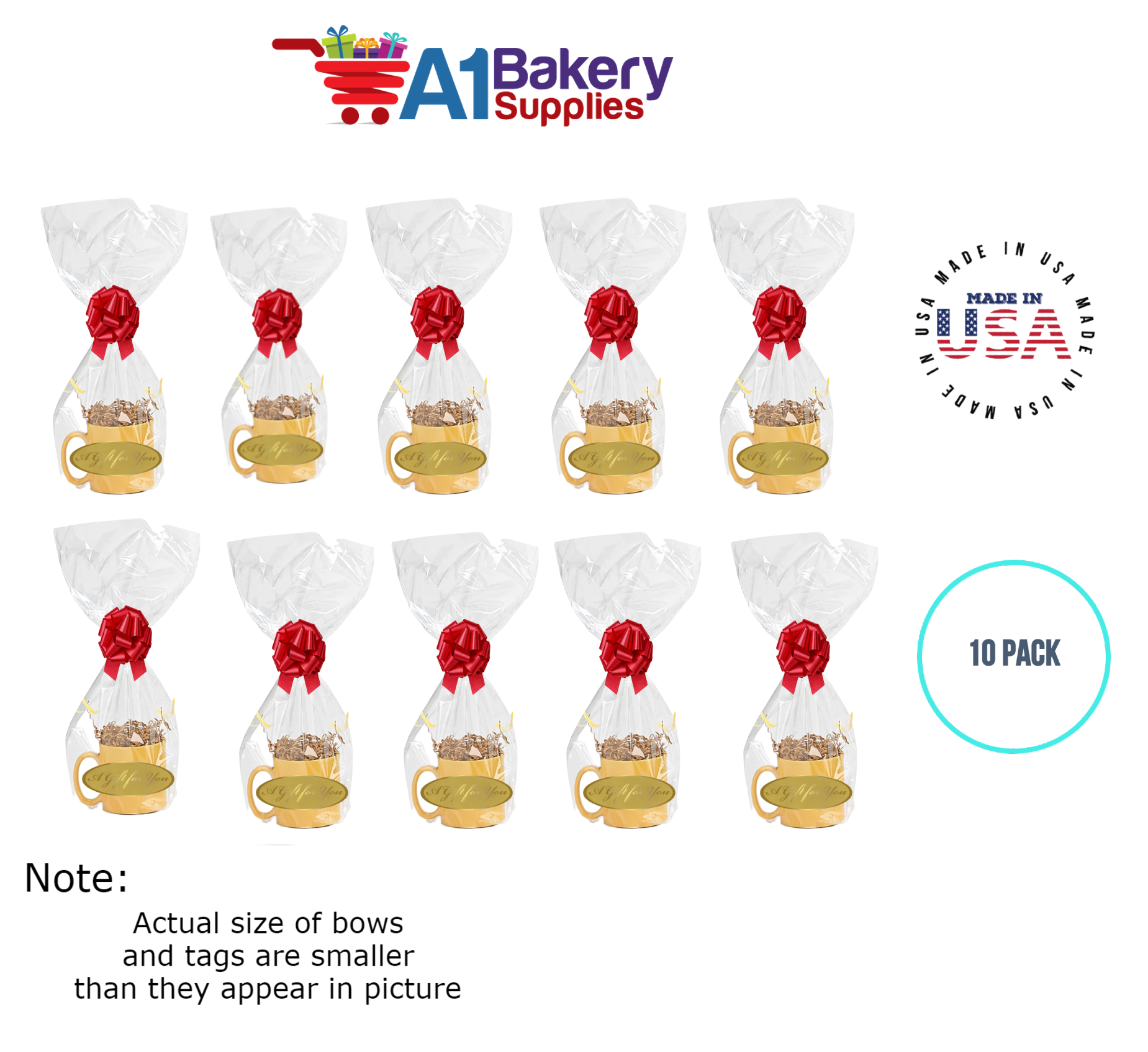- In this order you will receive 10 Red bows , 10 thank you , 10 gift for you , 10 made with love tag and no gift basket is provided , it is only for the picture purpose and only cellophane bags are selling .