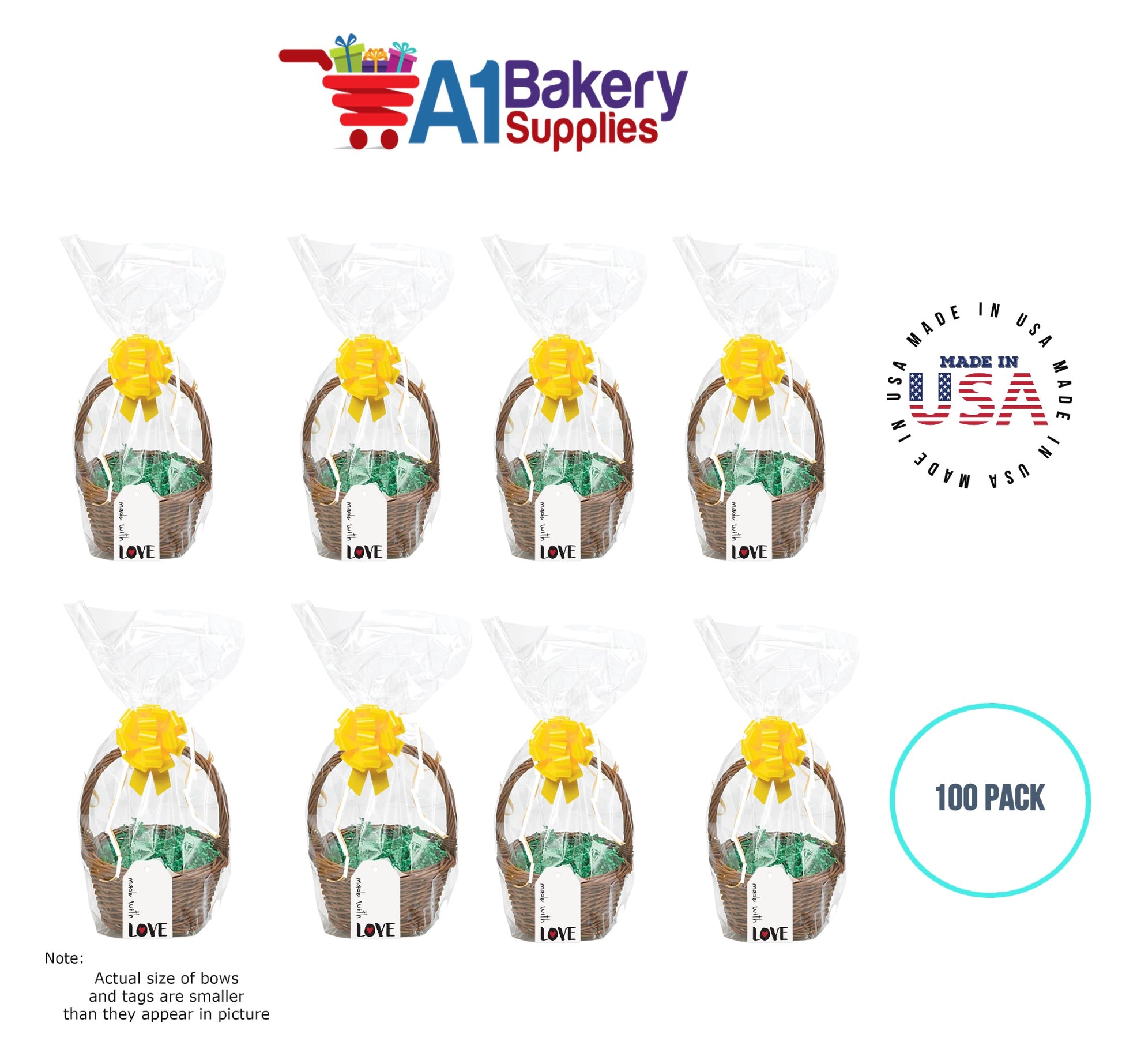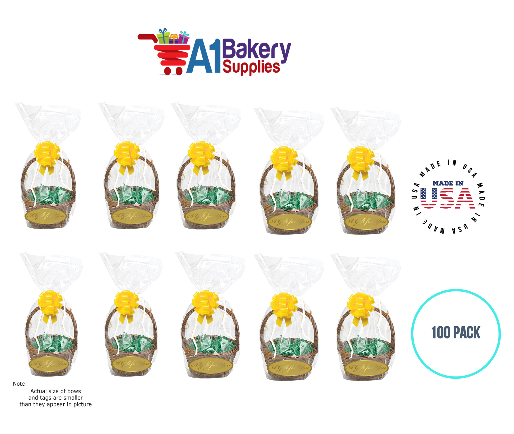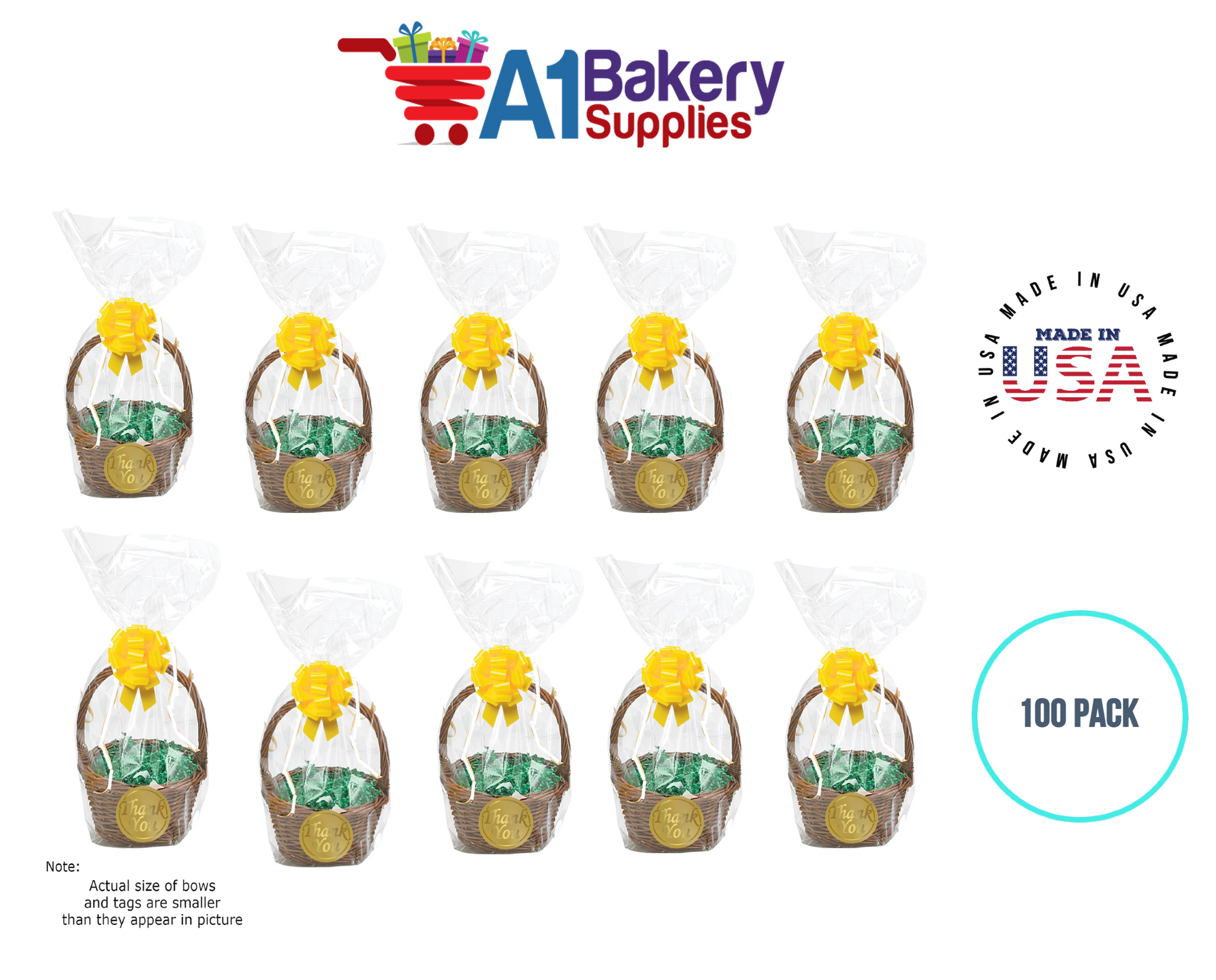 - In this order you will receive 100 Yellow bows , 100 thank you , 100 gift for you , 100 made with love tag and no gift basket is provided , it is only for the picture purpose and only cellophane bags are selling .