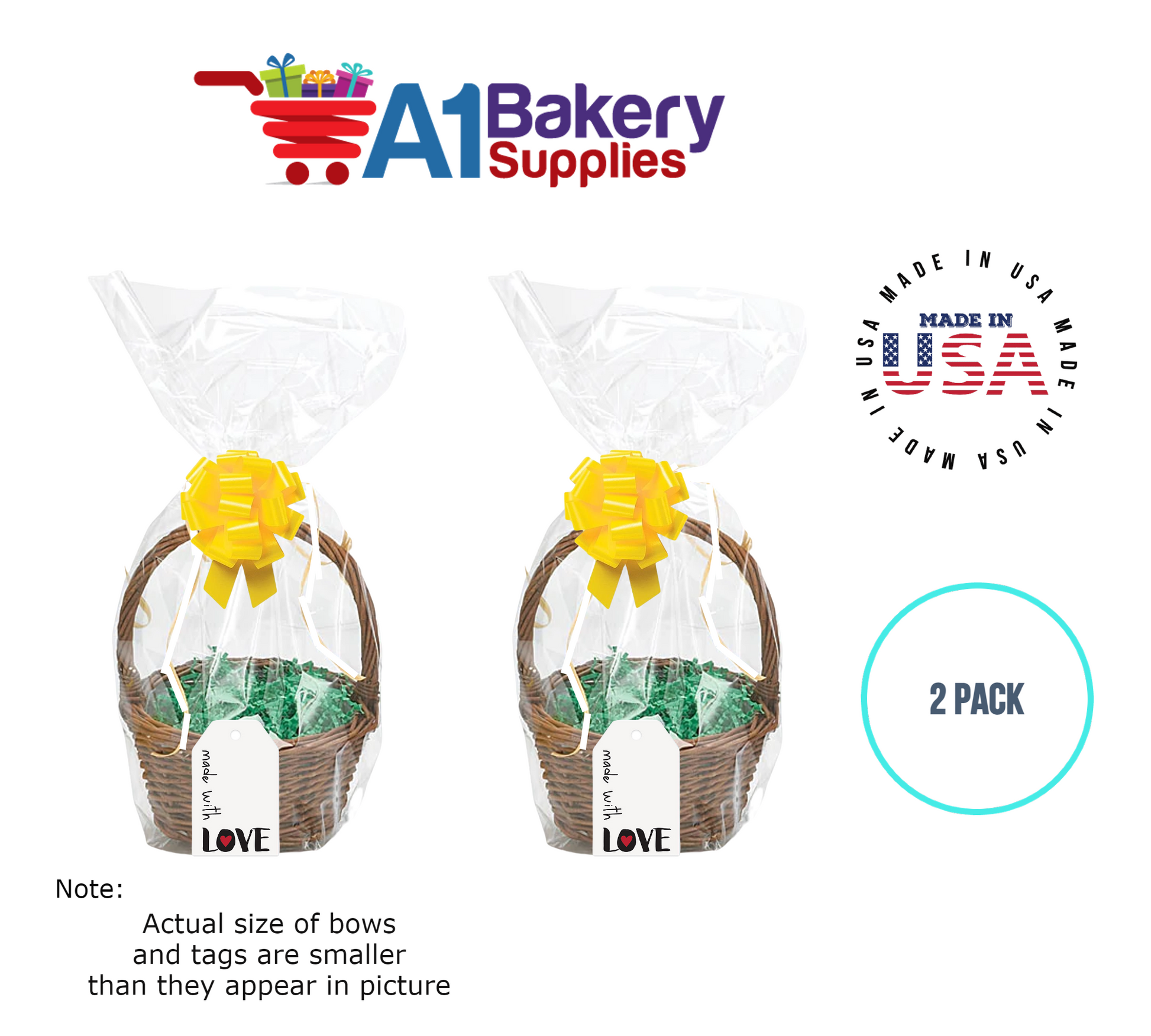 - In this order you will receive 2 Yellow bows , 2 thank you , 2 gift for you , 2 made with love tag and no gift basket is provided , it is only for the picture purpose and only cellophane bags are selling .