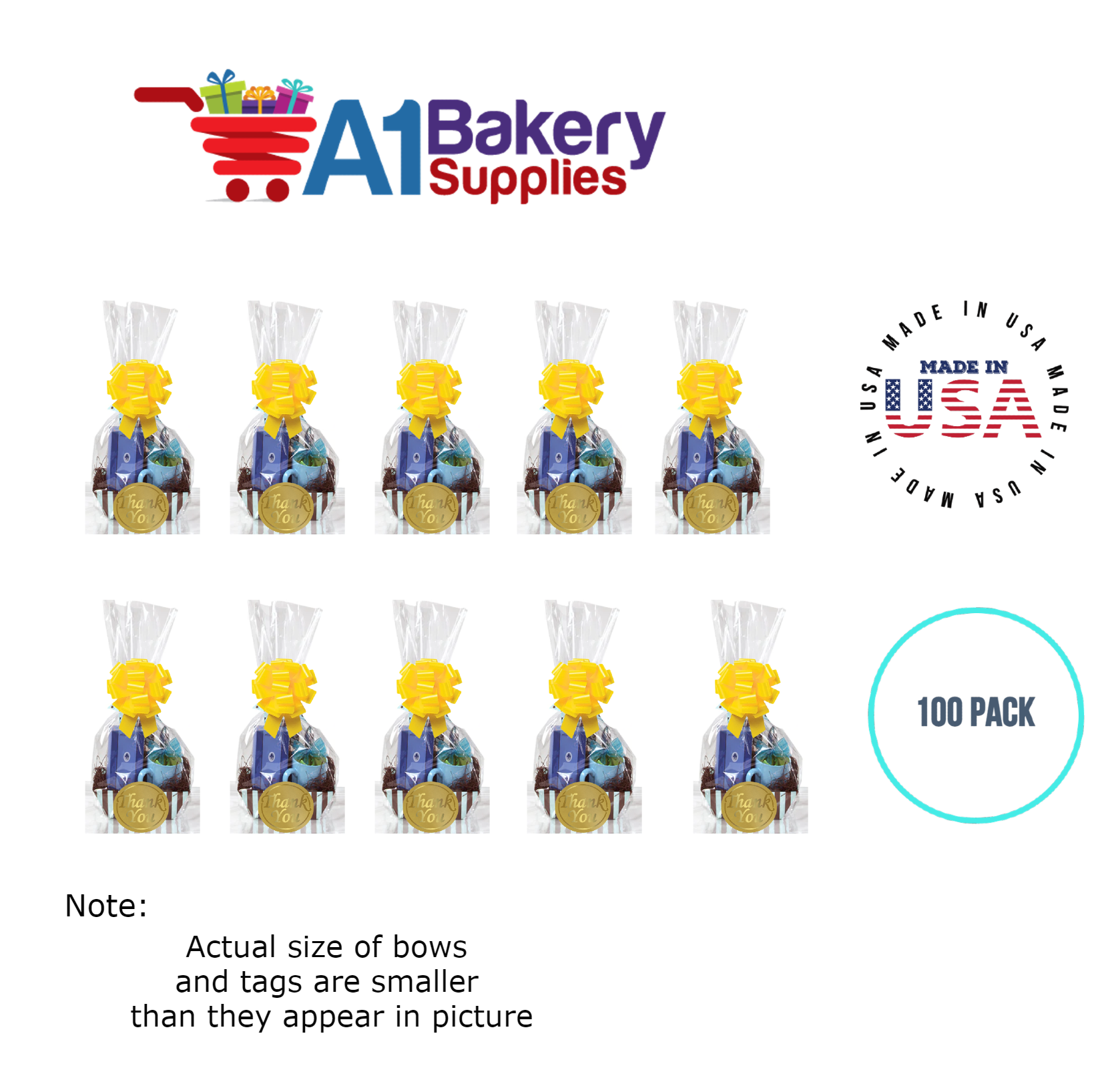 - In this order you will receive 100 Yellow bows , 100 thank you , 100 gift for you , 100 made with love tag and no gift basket is provided , it is only for the picture purpose and only cellophane bags are selling .