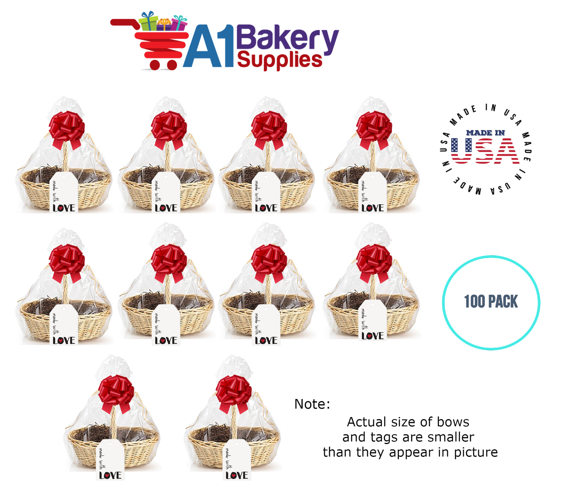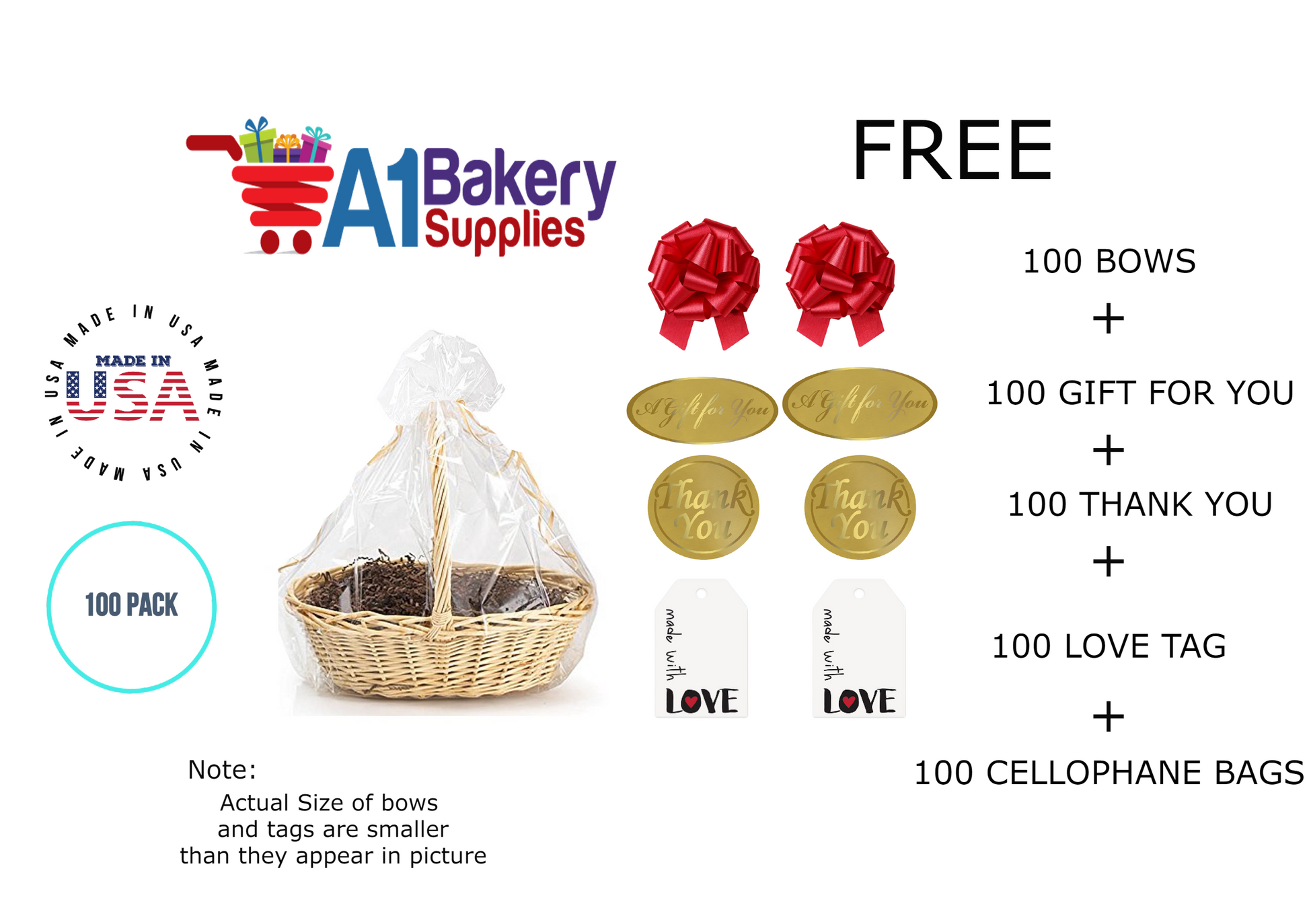 - In this order you will receive 100 Red bows , 100 thank you , 100 gift for you , 100 made with love tag and no gift basket is provided , it is only for the picture purpose and only cellophane bags are selling .