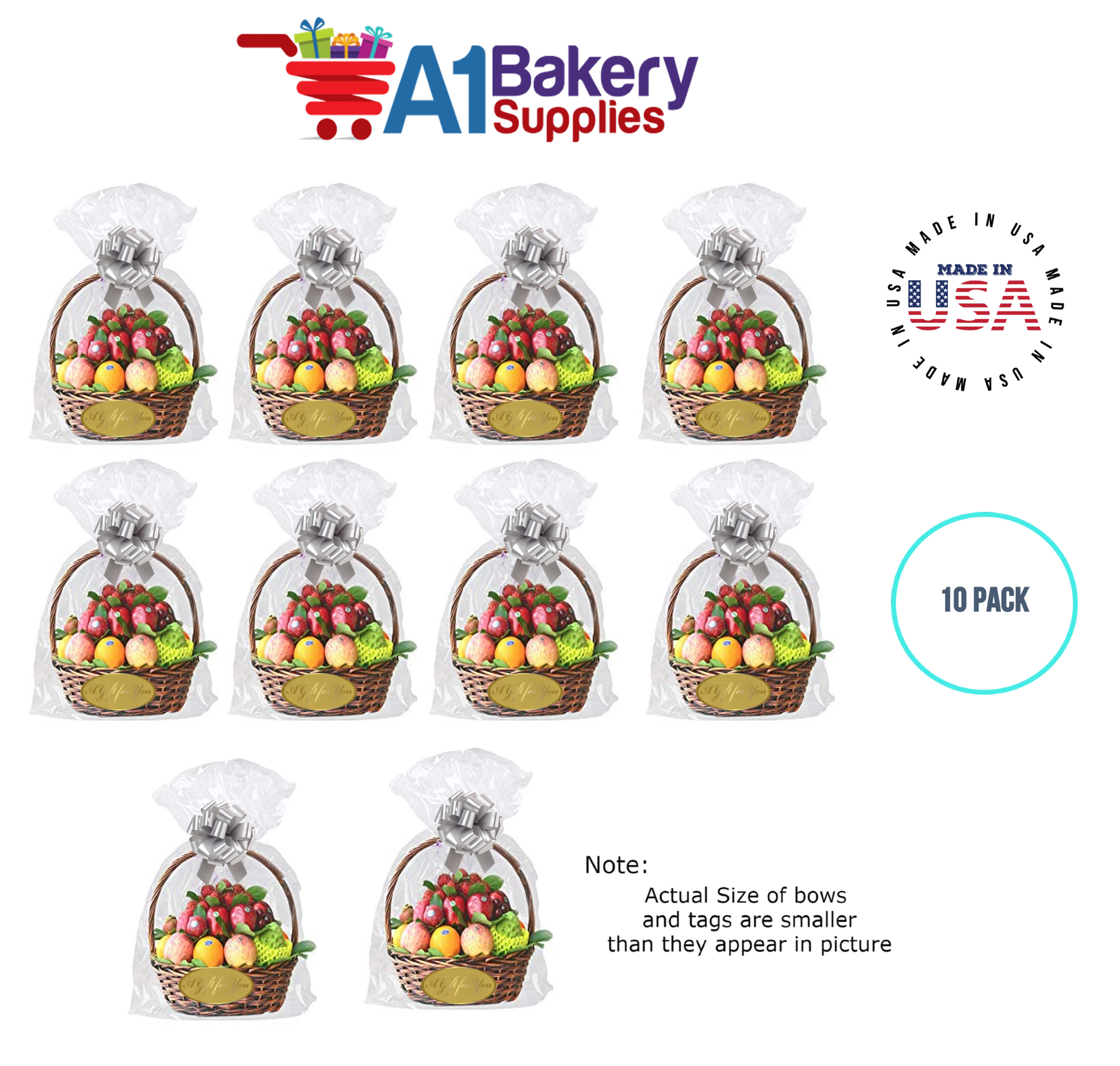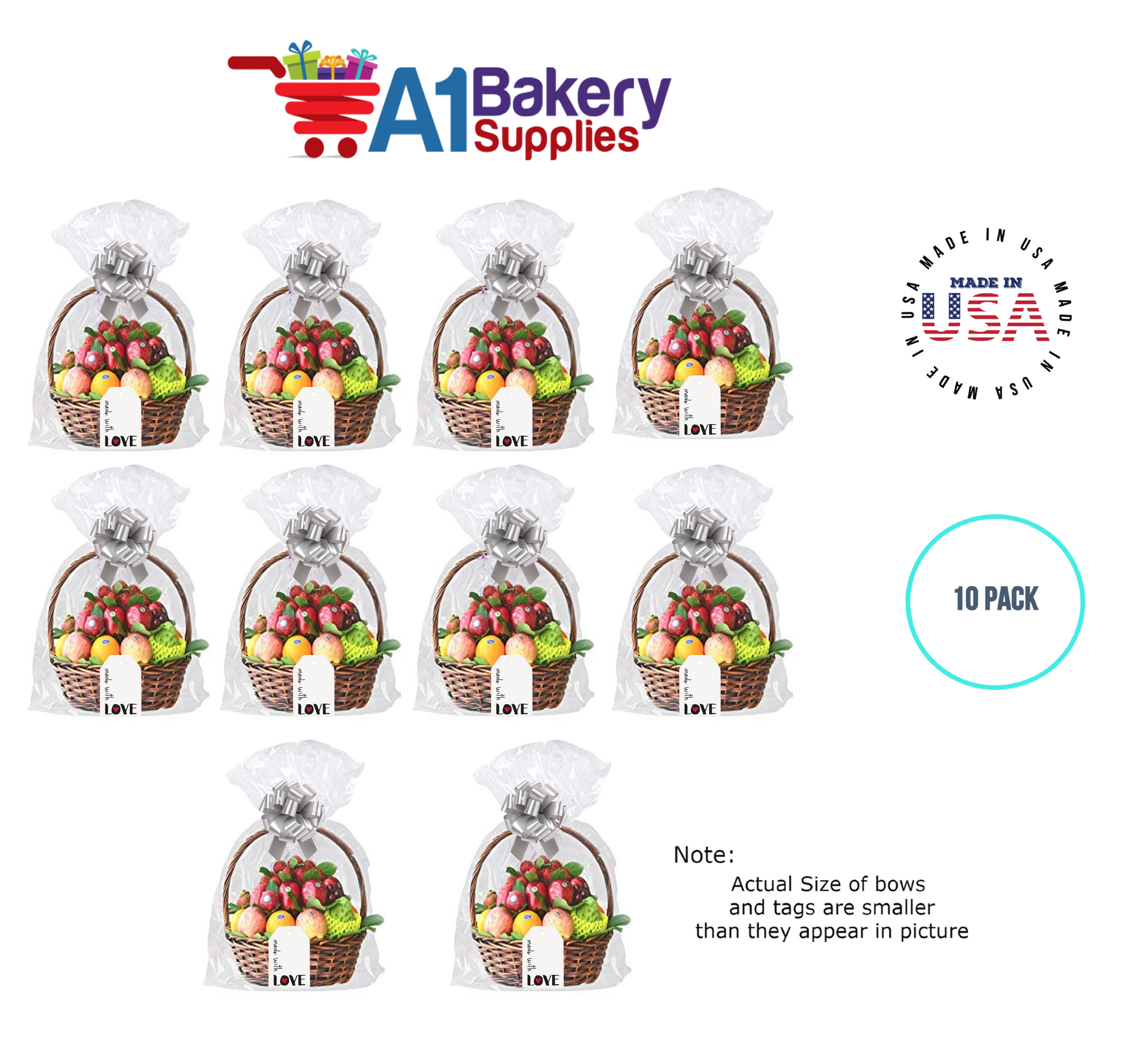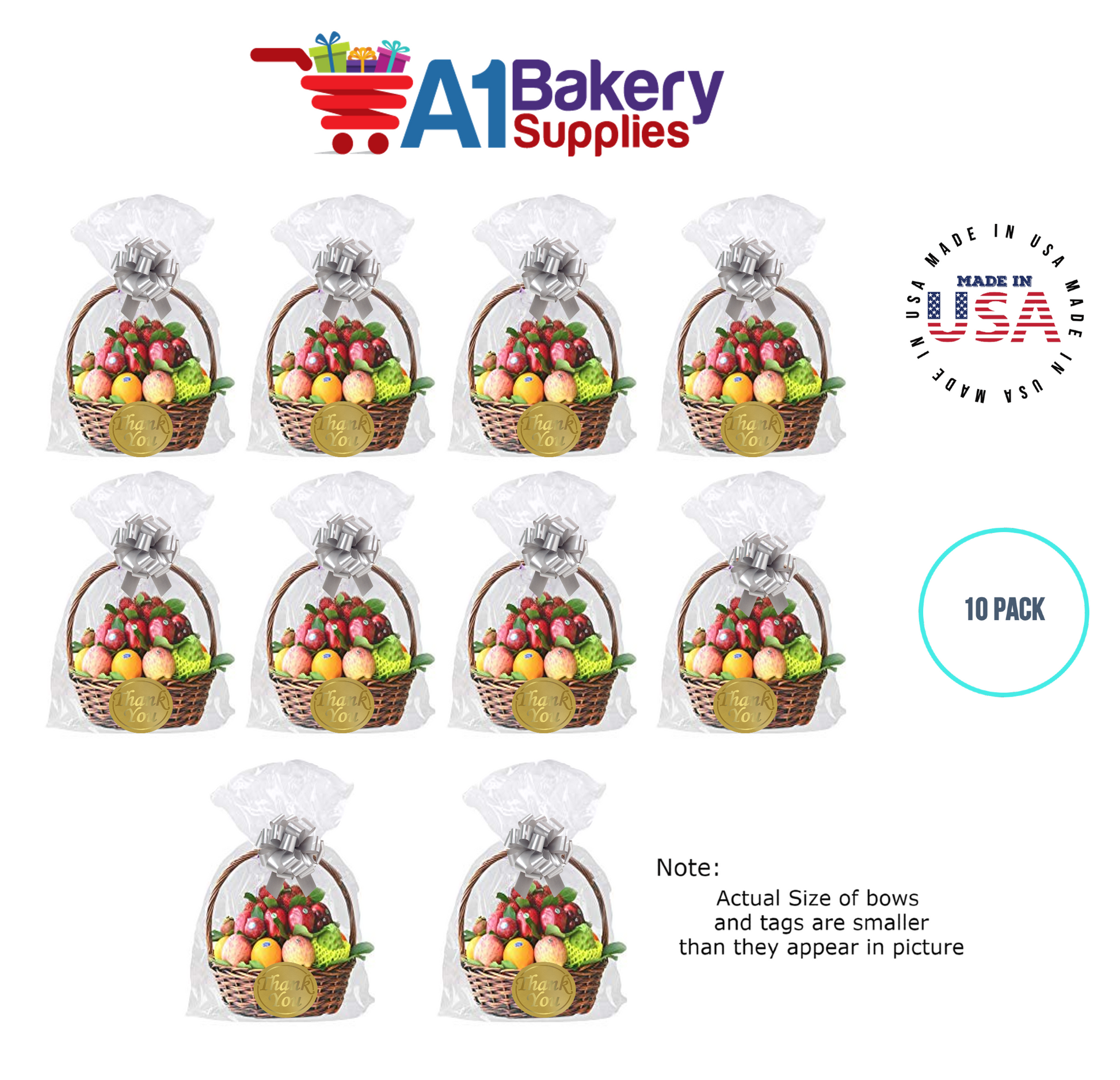 • In this order you will receive 10 Silver bows , 10 thank you , 10 gift for you , 10 made with love tag and no gift basket is provided , it is only for the picture purpose and only cellophane bags are selling .