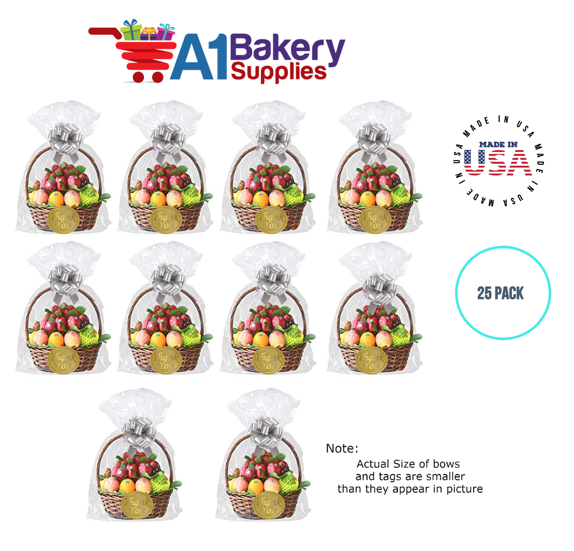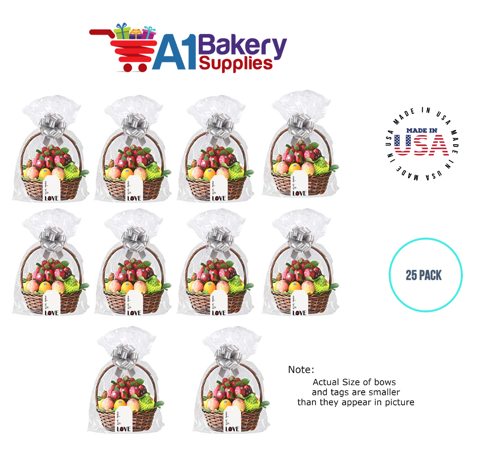 - In this order you will receive 25 Silver bows , 25 thank you , 25 gift for you , 25 made with love tag and no gift basket is provided , it is only for the picture purpose and only cellophane bags are selling .