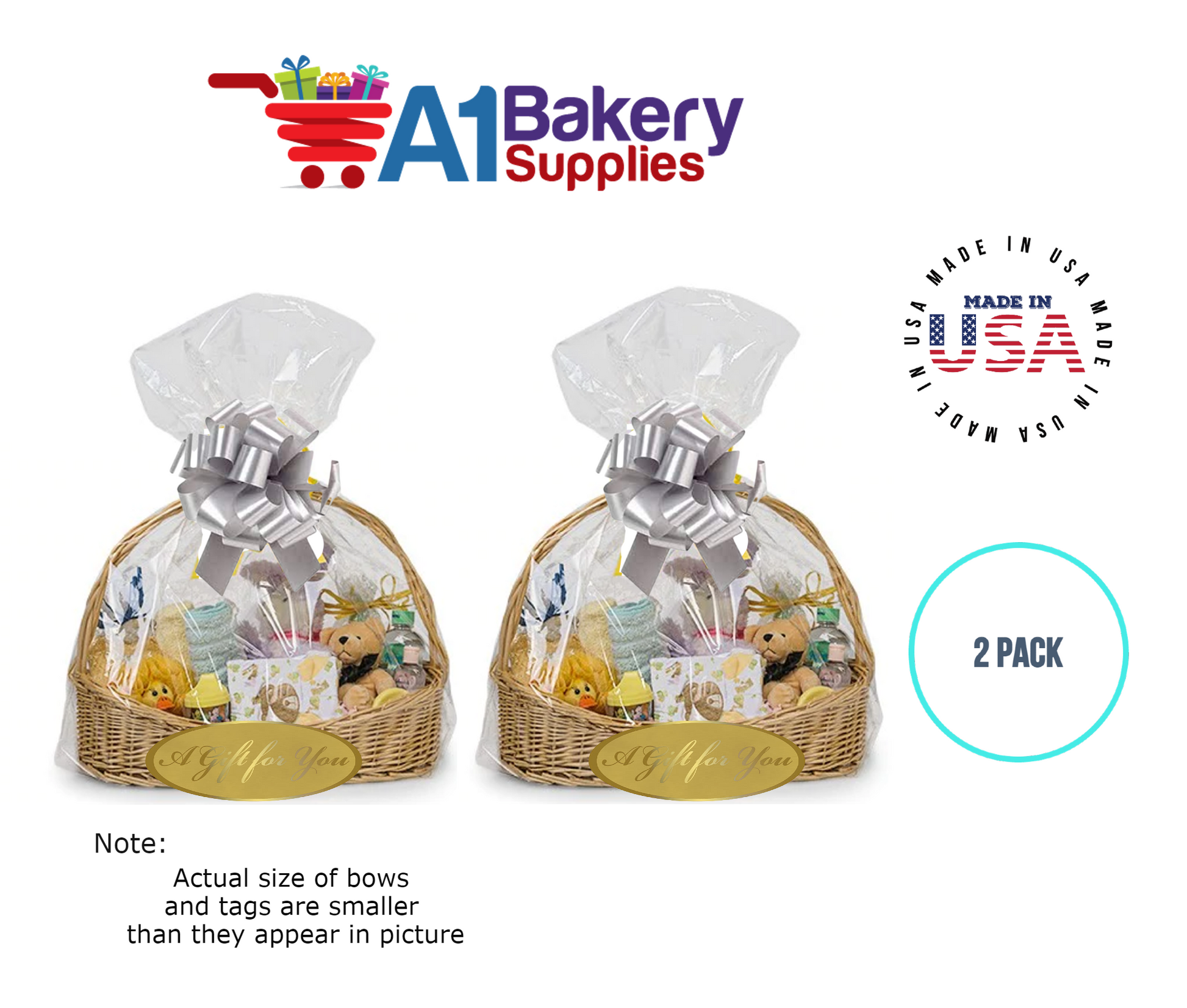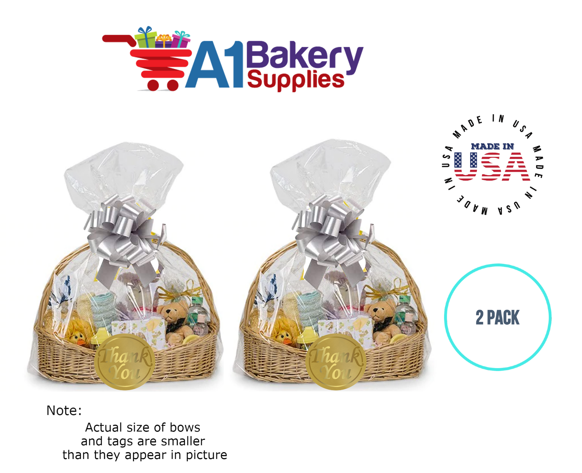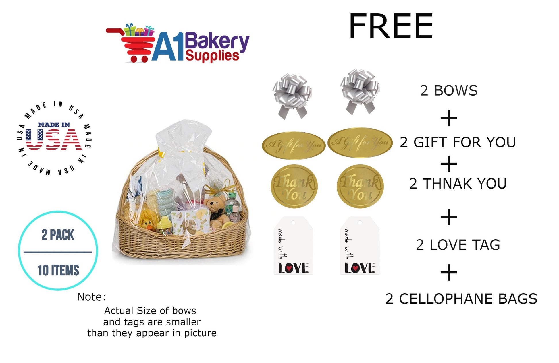 • In this order you will receive 2 Silver bows , 2 thank you , 2 gift for you , 2 made with love tag and no gift basket is provided , it is only for the picture purpose and only cellophane bags are selling .