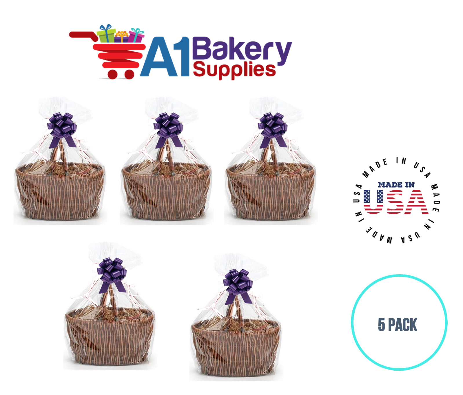 - In this order you will receive 5 purple bows , 5 thank you , 5 gift for you , 5 made with love tag and no gift basket is provided , it is only for the picture purpose and only cellophane bags are selling .