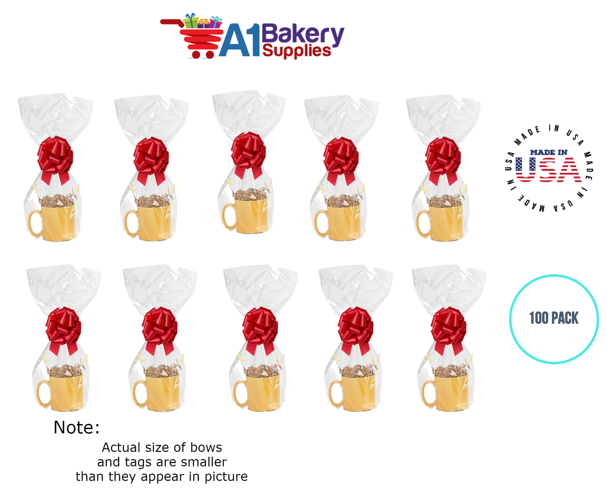 - In this order you will receive 100 Red bows , 100 thank you , 100 gift for you , 100 made with love tag and no gift basket is provided , it is only for the picture purpose and only cellophane bags are selling .