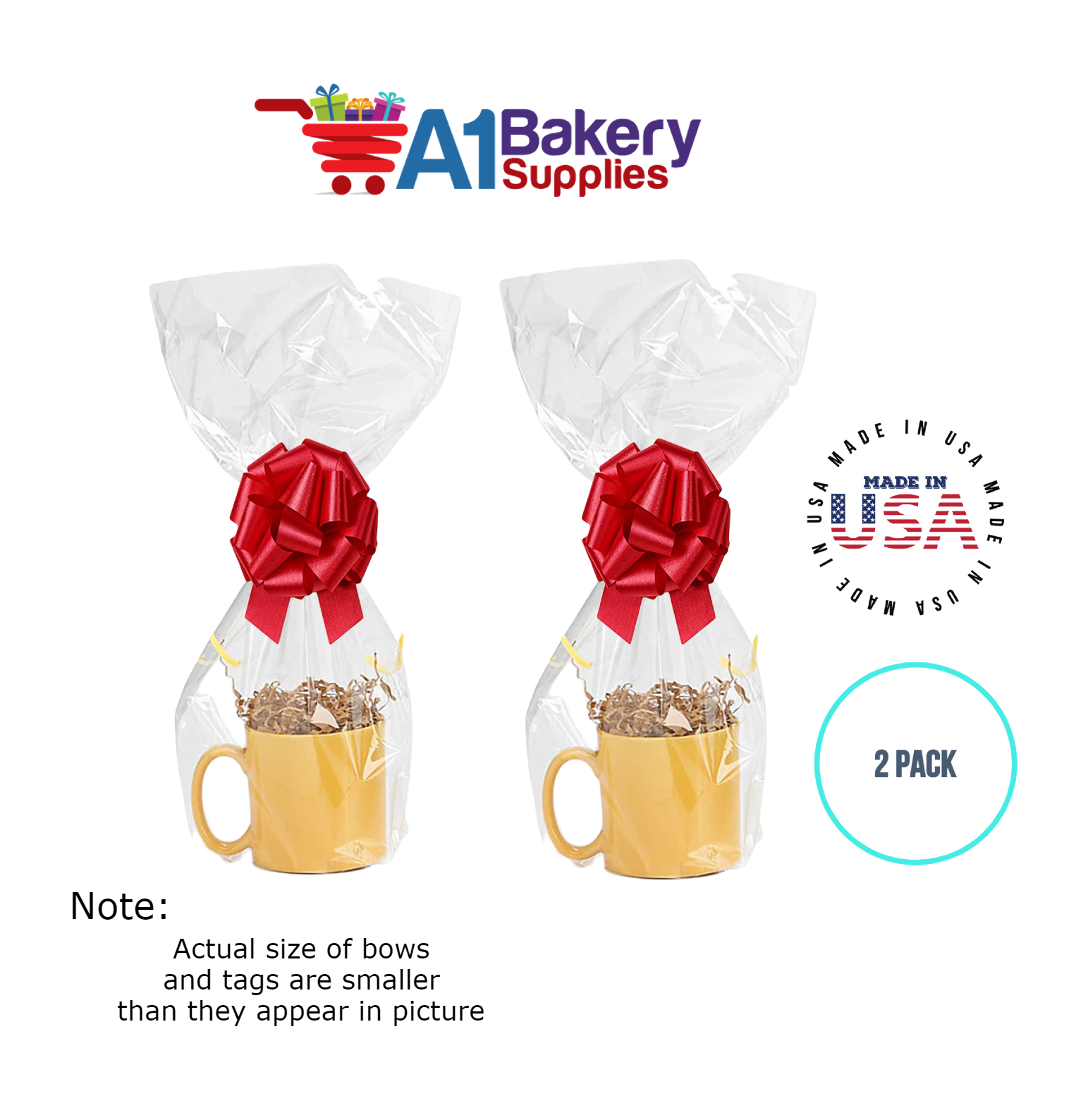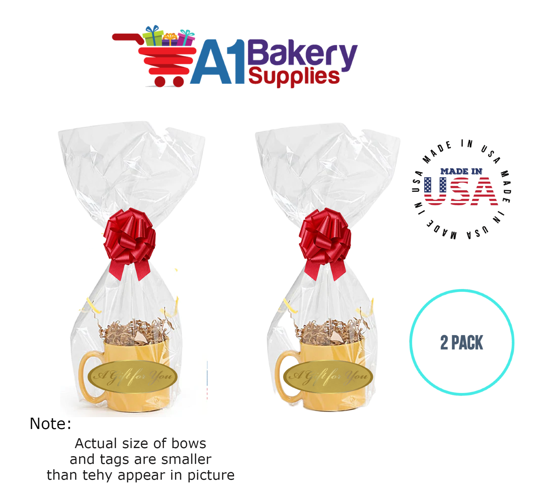 • In this order you will receive 2 Red bows , 2 thank you , 2 gift for you , 2 made with love tag and no gift basket is provided , it is only for the picture purpose and only cellophane bags are selling .