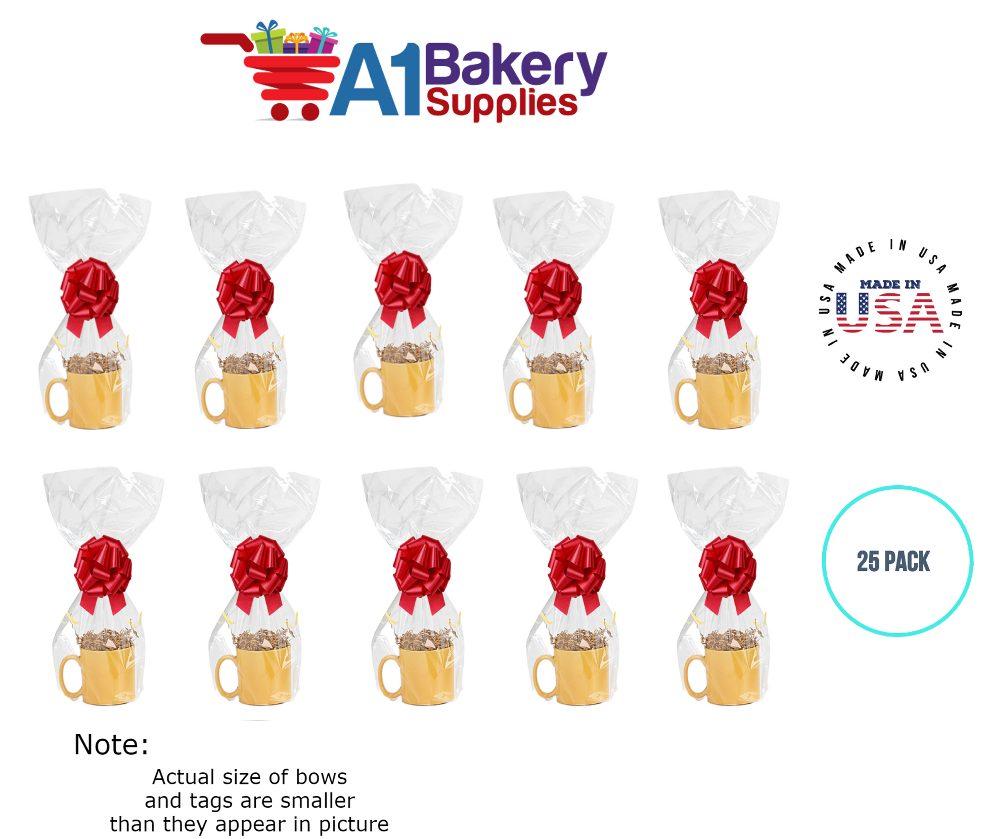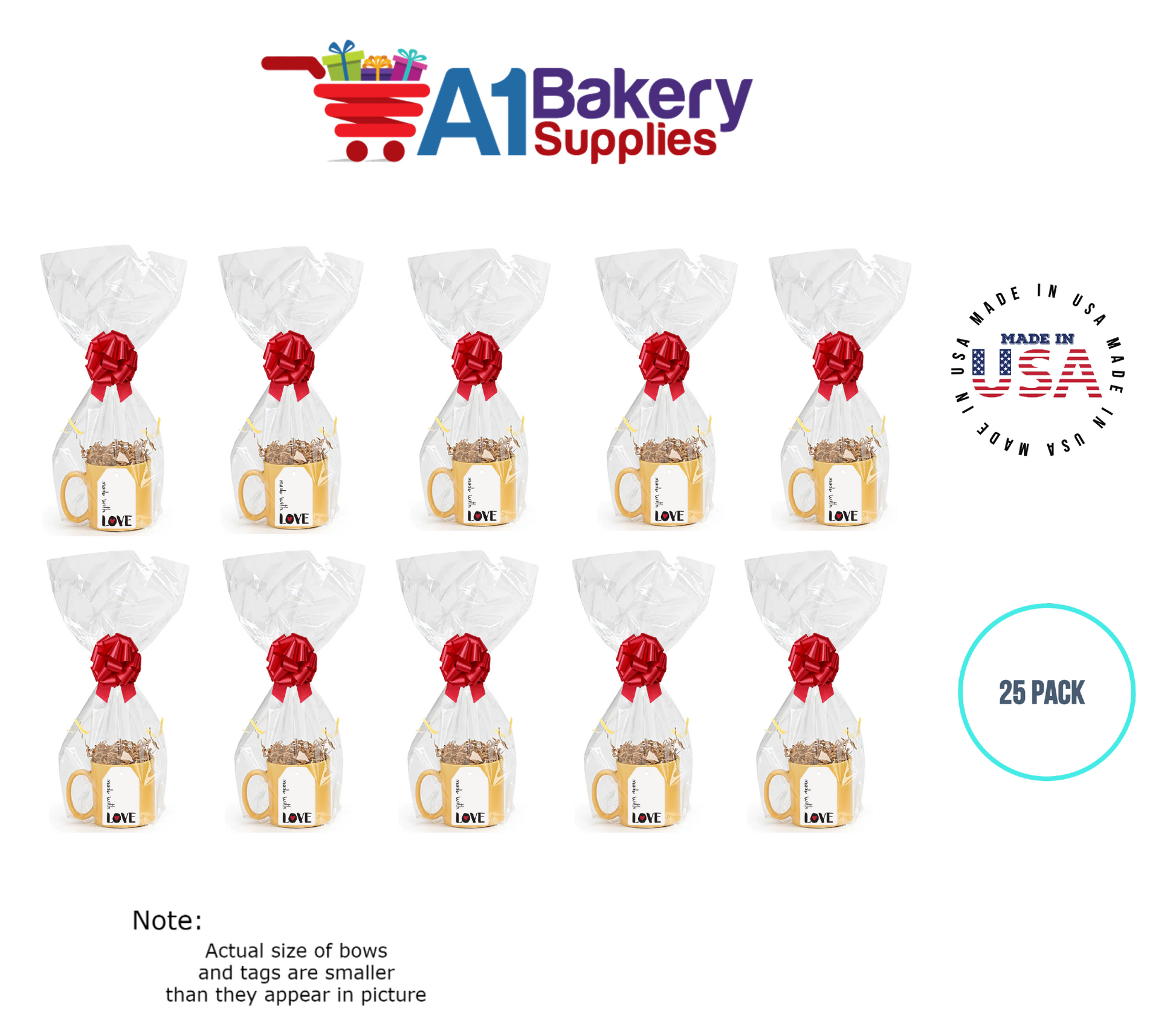 - In this order you will receive 25 Red bows , 25 thank you , 25 gift for you , 25 made with love tag and no gift basket is provided , it is only for the picture purpose and only cellophane bags are selling .