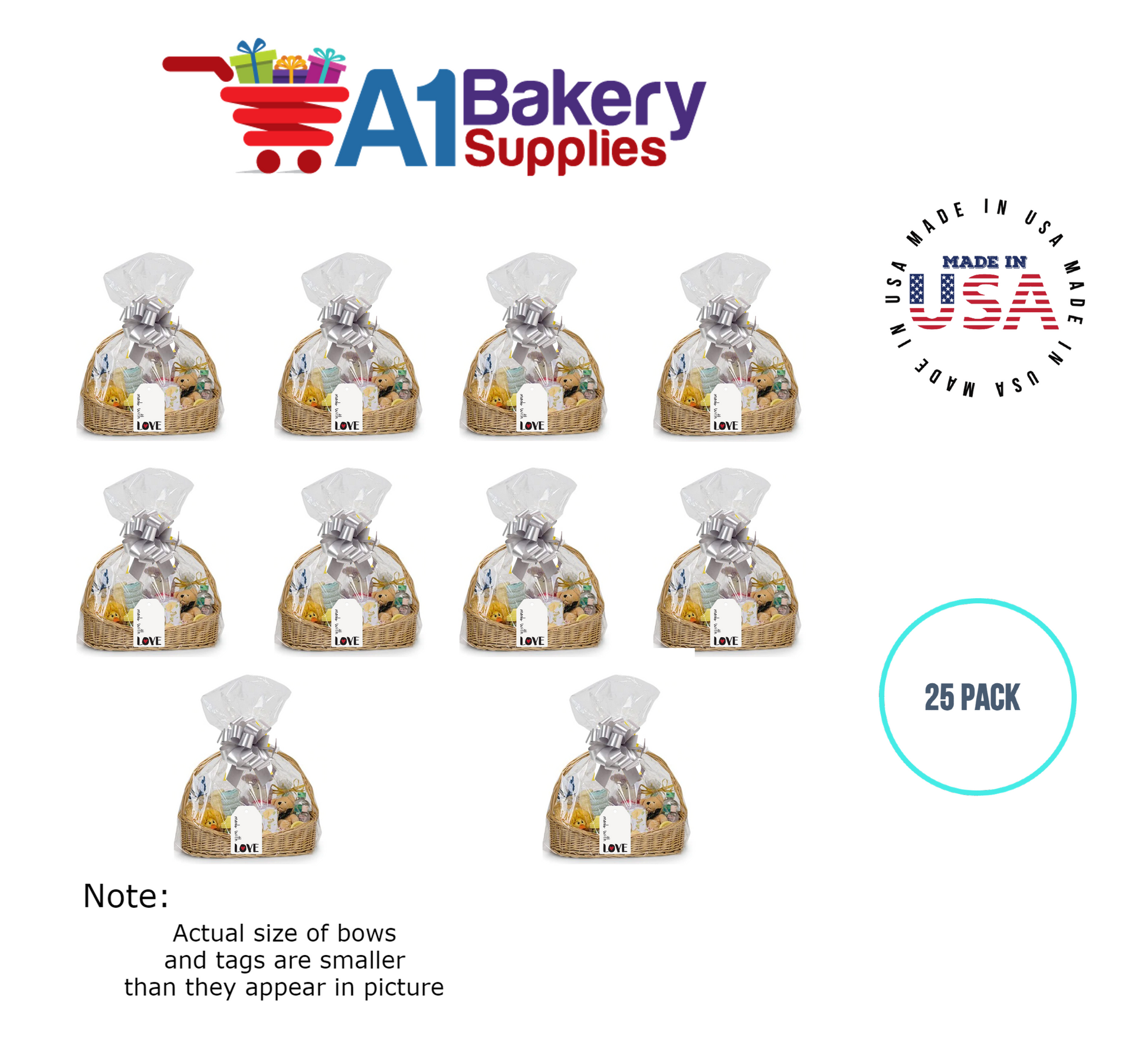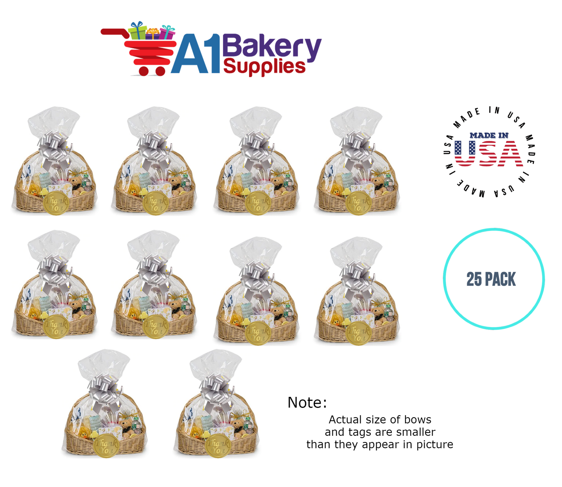- In this order you will receive 25 Silver bows , 25 thank you , 25 gift for you , 25 made with love tag and no gift basket is provided , it is only for the picture purpose and only cellophane bags are selling .
