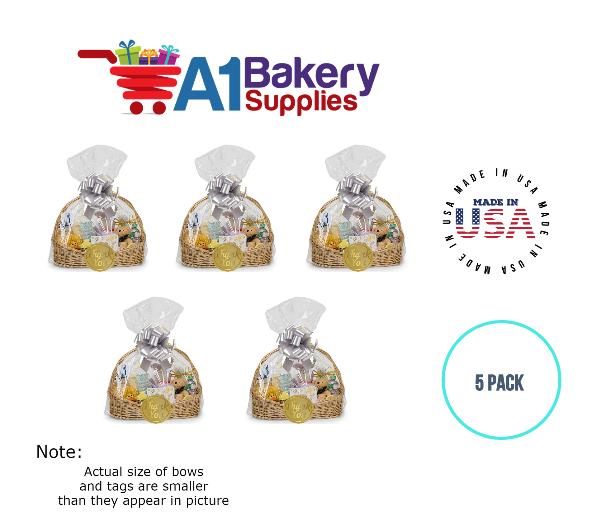 - In this order you will receive 5 Silver bows , 5 thank you , 5 gift for you , 5 made with love tag and no gift basket is provided , it is only for the picture purpose and only cellophane bags are selling .
