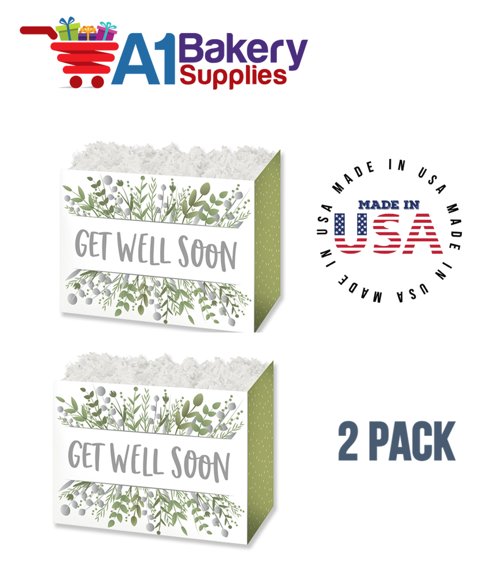 - Get Well Greenery small basket boxes features a metallic silver Get Well Soon text surrounded by greenery.